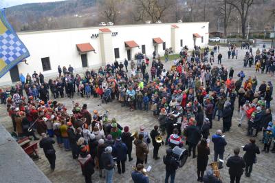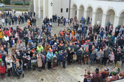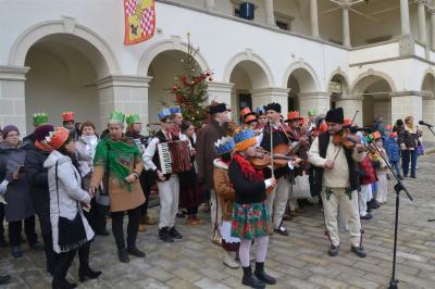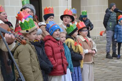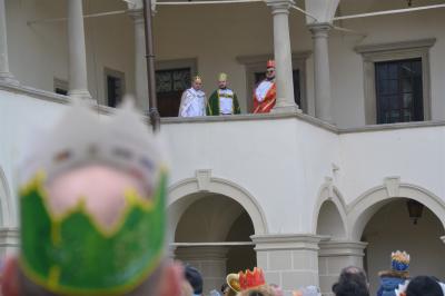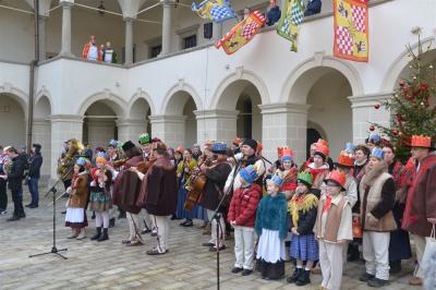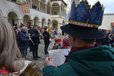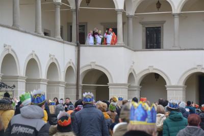 Po dotarciu na zamkowy dziedziniec Trzej Królowie, którzy wędrowali na czele orszaku, weszli na krużganki, aby symbolicznie pozdrowić uczestników uroczystości. Następnie rozpoczęło się wspólne kolędowanie, które zainicjowały i poprowadziły regionalne zespoły „Ziemia Suska” i „Mała Ziemia Suska” z towarzyszącą im kapelą, Chór „Jasień” oraz Miejska Orkiestra Dęta.