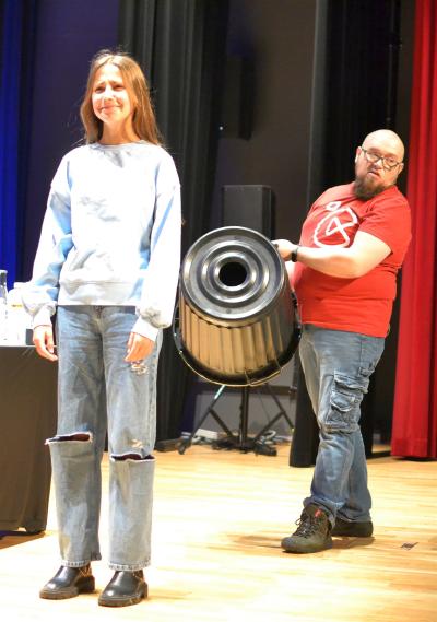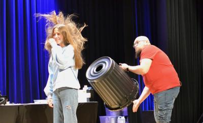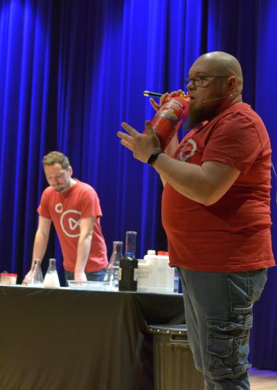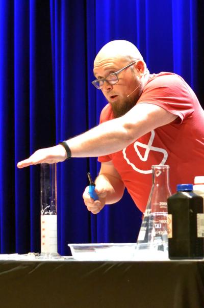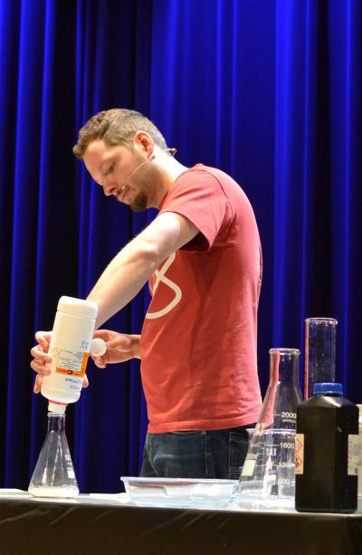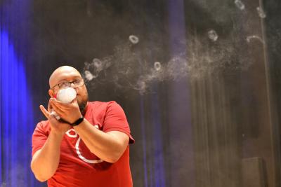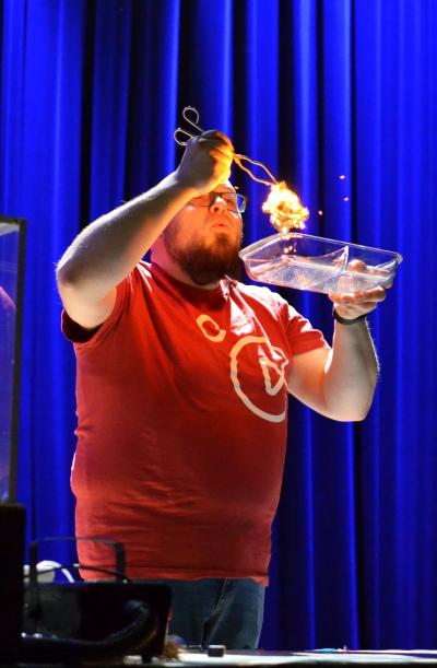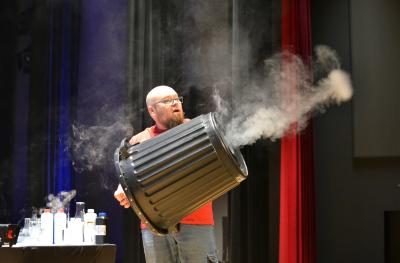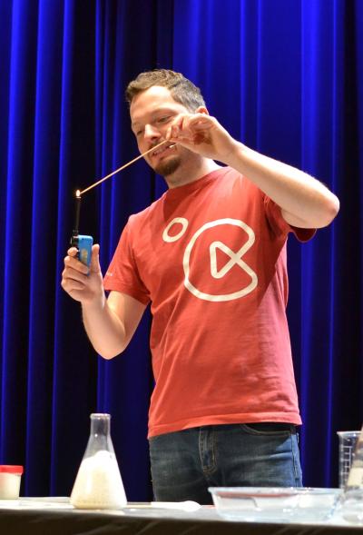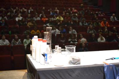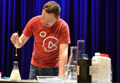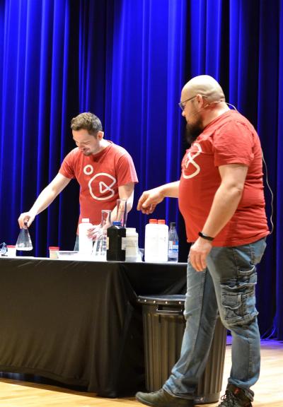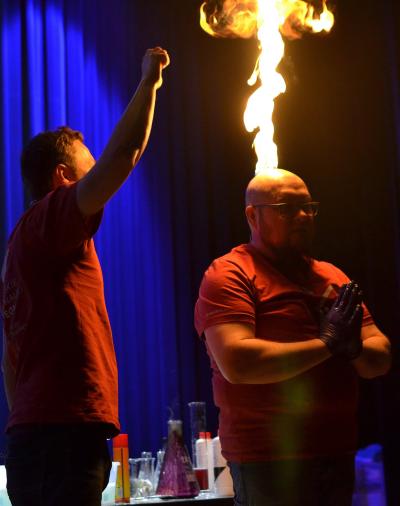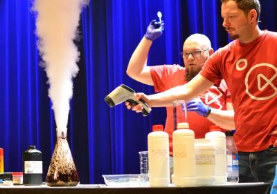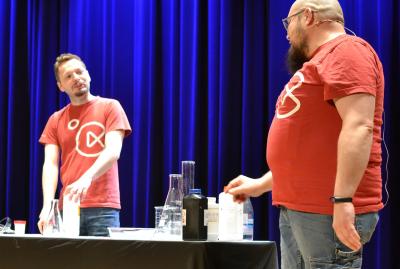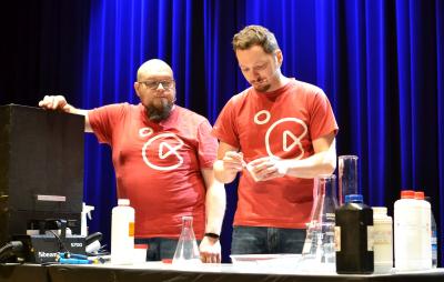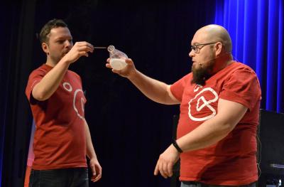 We wczorajsze i dzisiejsze (27-28 luty) przedpołudnia Sala Widowiskowa Centrum Kultury i Filmu w Suchej Beskidzkiej stała się laboratorium chemicznym. Stało się to dzięki zaproszonym animatorom Małopolskiego Centrum Nauki Cogiteon którzy w trakcie bardzo widowiskowych pokazów odkrywali przed uczniami suskich szkół podstawowych świat nauki.