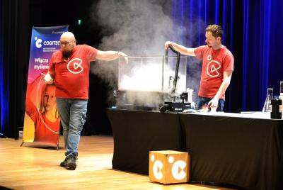Wprawdzie budynek Małopolskiego Centrum Nauki Cogiteon dopiero powstaje, ale sama instytucja już funkcjonuje jako Mobilny Projekt Edukacyjny Naukowiej. Animatorzy Cogiteonu w oryginalny sposób prezentują doświadczenia, angażują do wspólnego działania i zachęcają do samodzielnego eksperymentowania, gdyż nierzadko korzystają z tanich, łatwo dostępnych produktów i przedmiotów, które znajdziemy w każdym domu. W dniach 27 i 28 lutego ich pokazy z zainteresowaniem obejrzeli uczniowie suskich szkół podstawowych, zaproszeni przez Centrum Kultury i Filmu, będące organizatorem wydarzenia. Animatorzy Cogiteonu połączyli eksperymenty chemiczne z zagadnieniami związanymi z ochroną środowiska i bezpieczeństwa. Tematem przewodnim warsztatów było bowiem powietrze, w tym jego zawartość oraz to co w nim wisi, skąd się bierze i jaki ma wpływ na nasze otoczenie. Obserwując kolejne bardzo widowiskowe doświadczenia uczniowie nie tylko mieli okazję zdobyć nową wiedzę z zakresu chemii i powtórzyć już posiadaną, ale także przypomnieć sobie czym jest niska emisja i jakie skutki powoduje. A w myśl naukowego powiedzenia, że każda akcja powoduje reakcję, to tych było bez liku, co już wzbudzało zachwyt publiczności. Nie bez znaczenia na przebieg spotkania był sposób prowadzenia zajęć przez animatorów, którzy odkrywali świat nauki w sposób przystępny, swobodny i zarazem z dużą dozą humoru.