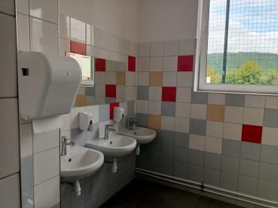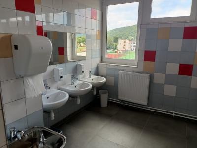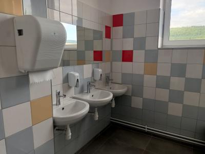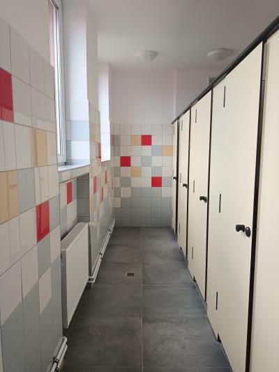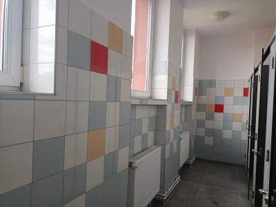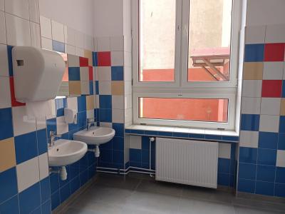 Zakres robót obejmował całkowitą przebudowę pięciu węzłów sanitarnych, w których wymieniono instalacje elektryczną oraz wodno-kanalizacyjną, położono nowe okładziny podłogowe. Na ścianach ułożono kolorowe płytki, co powoduje, że teraz pomieszczenia sanitarne są jeszcze bardziej przyjazne dla uczniów. Ponadto zamontowano w nich nową stolarkę drzwiową i kabiny z płyt PHL. Wymieniono także urządzenia, montując je na wysokości odpowiadającej wzrostowi dzieci.