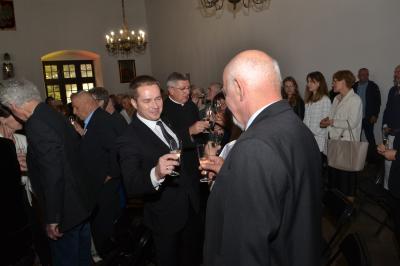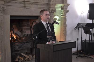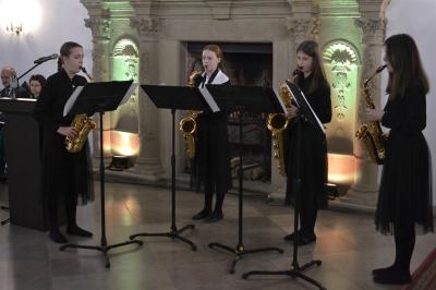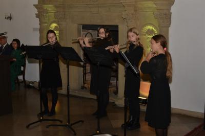 Po wręczeniu medali nadszedł moment na wzniesienie toastu lampką szampana. Uroczystość umilili swoim występem - uczniowie szkoły muzycznej I Stopnia w Suchej Beskidzkiej, soliści: skrzypaczka Liliana Bielarz, akordeonista Krzysztof Kozieł, a także kwartety - saksofonowy w składzie: Klaudia Knapczyk, Anastazja Mirocha, Julia Pajor, Martyna Kania oraz fletowy w składzie: Justyna Chowaniak, Oliwia Hernas, Karolina Meller, Hanna Trzebuniak, natomiast w repertuarze rozrywkowym wystąpił nauczyciel Pan Andrzej Lasek, który zagrał na fortepianie.