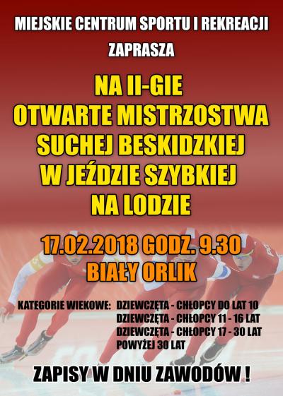 Miejskie Centrum Sportu i Rekreacji w Suchej Beskidzkiej serdecznie zaprasza dzieci oraz dorosłych na II Otwarte Mistrzostwa Suchej Beskidzkiej w Jeździe Szybkiej na Lodzie. Zawody odbędą się na lodowisku „Biały Orlik” w dniu 17.02.2018r. o godzinie 9:30.