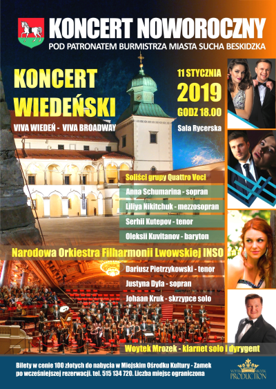 Koncerty Noworoczne pod patronatem Burmistrza Miasta Sucha Beskidzka to wydarzenia kulturalne o szczególnej renomie, dzięki którym w Suchej Beskidzkiej goszczą wybitni śpiewacy i światowej sławy muzycy. Koncerty Noworoczne wpisały się już na stałe w kalendarz imprez organizowanych w naszym mieście i co roku cieszą się ogromnym zainteresowaniem. XVI koncert odbędzie się 11 stycznia 2019 roku (piątek) o godz. 18.00 w Sali Rycerskiej Suskiego Zamku.