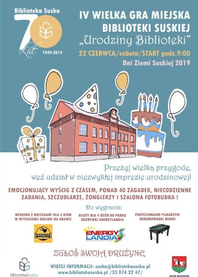 Obchody Dni Ziemi Suskiej 2019 rozpoczną się w sobotę 22 czerwca o godz. 9.00 czwartą edycją Wielkiej Gry Miejskiej Biblioteki Suskiej pod tytułem „Urodziny Biblioteki”. W poprzednich latach gracze rozwiązywali zagadki detektywistyczne, śledzili losy Billy’ego Wildera i poznawali tajemnicę smoka Kicka. Tym razem w związku z tegorocznym jubileuszem 70 - lecia Biblioteki Suskiej motywem przewodnim będą urodziny biblioteki. W ciągu kilku godzin na „planszy”, jaką stanie się miasto, drużyny będą musiały rozwikłać ponad czterdzieści łamigłówek oraz niecodzienne zadania specjalne, w rozmieszczonych na terenie Suchej punktach kontrolnych. Dla wszystkich uczestników udział w kolejnej edycji Gry Miejskiej będzie doskonałą zabawą, a na najlepszych zawodników na mecie czekać będą jak zawsze atrakcyjne nagrody. Do wygrania: weekend z noclegami i atrakcjami dla czterech osób w Wypasionej Dolinie na Orawie, cztery karnety do Energylandii oraz profesjonalny stół do piłkarzyków. Zgłoszenia drużyn przyjmowane będą w Bibliotece Suskiej, ul. Piłsudskiego 23, nr tel. 33 874 22 47, e-mail: sucha@bibliotekasuska.pl do dnia 21.06.2019 do godz.15:00. Więcej informacji na temat gry na stornie internetowej www.bibliotekasuska.pl.