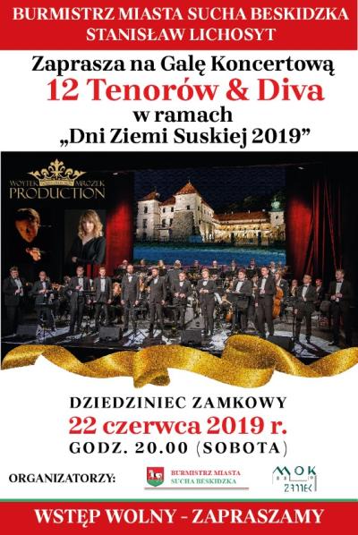 W sobotnie popołudnie 22 czerwca na zamkowych estradach zagości muzyka klasyczna i folkowa. Na scenie w parku zamkowym wystąpią uczniowie suskiej Szkoły Muzycznej. Po nich przez kilka popołudniowych godzin na estradzie królować będzie folklor w najlepszym wydaniu, za sprawą naszych rodzimych kapel i zespołów regionalnych, po których na scenie pojawi zespół 9siył oraz „Potock” - zespół folkowy, łączący czysty rock z tradycyjną, karpacką muzyką ludową. Wieczorem o godz. 20.00 na dziedzińcu odrestaurowanego zamku suskiego zapraszamy na wyjątkową galę koncertową 12 Tenorów&Diva, podczas której będzie można usłyszeć zarówno najpiękniejsze fragmenty oper i operetek, najsłynniejsze pieśni neapolitańskie, jak i specjalnie zaaranżowane utwory współczesnej muzyki rozrywkowej w wykonaniu znakomitych solistów oraz Narodowej Orkiestry Filharmonii Lwowskiej pod batutą Wojciecha Mrozka. Na zamkowej estradzie zabrzmią takie ponadczasowe przeboje jak „Granada”, czy też hit Jana Kiepury „Brunetki Blondynki”, „Unbrake My Heart”, „We Will Rock You” zespołu Queen lub „YouRaise Me Up” Josha Grobana czy też przeboje grupy ABBA, W. Houston, i wiele innych. 12 Tenorów & DIVA to to pierwszy taki projekt muzyczny, który powstał w Polsce i jeden z nielicznych na światowym rynku. Charakterystycznym dla koncertów artystów - 12 Tenorów & Diva jest wirtuozeria wokalu. Zespół tworzą świetnie wykształceni wokaliści, którzy są laureatami prestiżowych, międzynarodowych konkursów wokalnych. Sobotni wieczór uwieńczy zabawa taneczna w parku zamkowym z zespołem Sing Team. Zespół zaprezentuje standardy muzyki rozrywkowej w różnych gatunkach, przy których każdy będzie mógł spróbować sowich umiejętności tanecznych na specjalnie przygotowanym parkiecie „pod gwiazdami”.