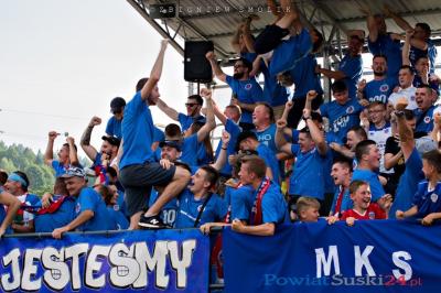 Mecz przyciągnął na trybuny rekordową, jak na rozgrywki tego szczebla widownię, w tym licznych fanów i sympatyków gospodarzy. Doping z wypełnionej po brzegi trybuny niósł się już na długo przed pierwszym gwizdkiem. Nic dziwnego bo losy awansu do V ligi ważyły się do ostatniej kolejki. Przez większą część sezonu oba zespoły w A- klasowej tabeli szły „łeb w łeb”, zajmując po rundzie jesiennej dwa czołowe miejsca i to z tą samą ilością punktów. W rundzie wiosennej było podobnie, jednak rywale ze Spytkowic zaliczyli nieco więcej potknięć na ligowych boiskach, tracąc kilka punktów. Ostatecznie w minioną sobotę liderowi tabeli MKS Babiej Górze do szczęścia potrzebny był zaledwie remis. Goście ze Spytkowic, aby awansować musieli wygrać. Na stadionie w Suchej Beskidzkiej nie brakowało emocji i dramaturgii. Drużyna Astry początkowo postawiła na defensywę, czekając na wykorzystanie jednej sytuacji, gospodarze zagrali również zachowawczo, jednak nieco żwawiej ruszyli do ataku. Wynik otworzył się po niespełna pięciu kwadransach gry, a dokładnie w 73 minucie. Bramkę dającą Babiej Górze prowadzenie zdobył Kamil Dyduch. Kibice do końca nie mogli być jednak pewni swego, bo w 90 minucie jedenastkę dla zespołu Astry na bramkę zamienił Szymon Babiuch. Do końca doliczonego czasu gry nie brakowało emocji i nerwów, wynik jednak nie uległ zmianie. Zwycięski remis 1:1 dał Babiej Górze pierwsze miejsce i awans do V ligi. W sezonie 2018/2019 zespół z Suchej Beskidzkiej wygrał 25 ligowych spotkań, cztery zremisował i zaliczył tylko jedną porażkę. W minioną sobotę, w meczu z Astrą Spytkowice drużyna MKS Babia Góra Sucha Beskidzka zagrała w składzie: Kachnic, Chrząszcz, P.Burliga, Żaczek, J.Talaga, G.Talaga, Wójtowicz (C), Dyduch (Mika 86 min.), Pacyga (K.Burliga 53 min.), Janiczak (Żmuda 80 min.), Kmiecik (65 min. Kociołek). Gratulujemy wszystkim zawodnikom, trenerom, zarządowi klubu i sympatykom drużyny znakomitego sezonu i zdobytego awansu, życząc jednocześnie udanego startu w nadchodzących piłkarskich zmaganiach na boiskach wadowickiej V ligi. Spoglądając na frekwencję, mobilizację i euforię kibiców z Suchej Beskidzkiej, jedno jest pewne: w przyszłym sezonie dopingu z trybun dla zawodników Babiej Góry nie zabraknie. (GW)