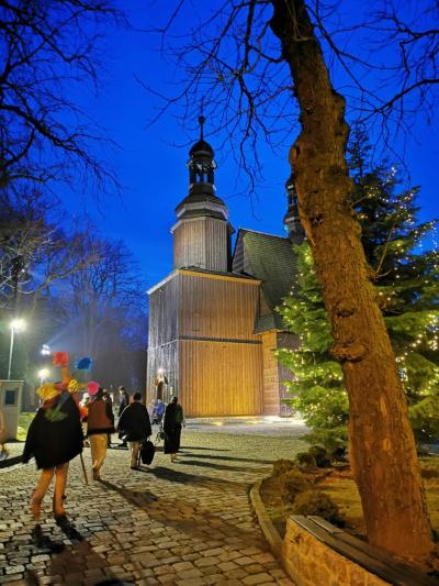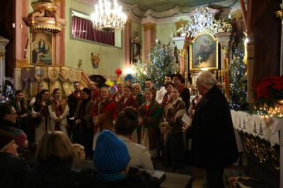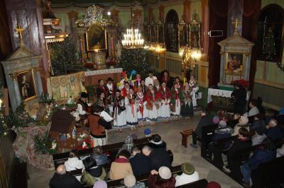 Wieczorem babiogórskie kolędy i pastorałki zabrzmiały z kolei w klimatycznym wnętrzu drewnianego Kościoła Wniebowzięcia Najświętszej Maryi Panny w Gliwicach. W radosnej, świątecznej, atmosferze widzowie zgromadzeni w kościele parafialnym wysłuchali śpiewu i melodii kolędniczych spod Babiej Góry, a także mieli okazję usłyszeć góralskie życzenia i poznać ludowy zwyczaj podsypywania owsem. Zespół wykonał również popularne polskie kolędy, a do wspólnego kolędowania chętnie przyłączyła się zasiadająca na widowni publiczność. Na zakończenie widzowie nagrozili artystów gromkimi brawami, a członkowie zespołu podziękowali publiczności za miłą atmosferę i serdeczne przyjęcie. Dzięki śpiewakom i instrumentalistom naszych rodzimych zespołów i kapel regionalnych, wśród których nie brakuje prawdziwych pasjonatów i miłośników folkloru, mieszkańcy Gliwic mogli poznać babiogórskie tradycje i bogactwo kultury naszego regionu. (GW)
