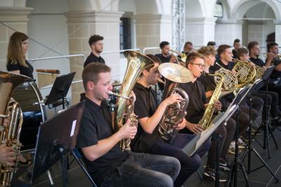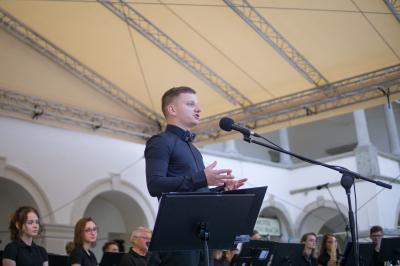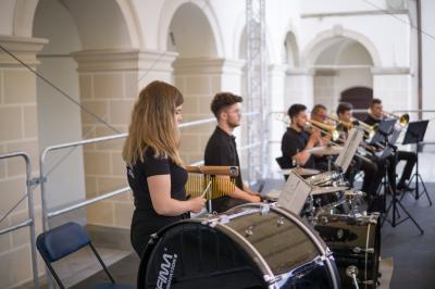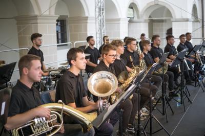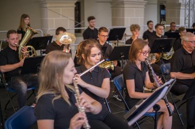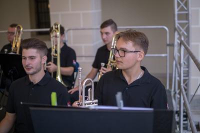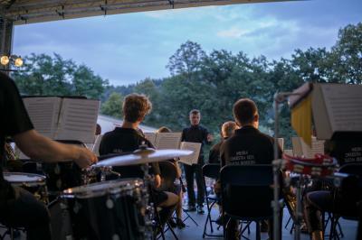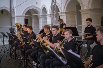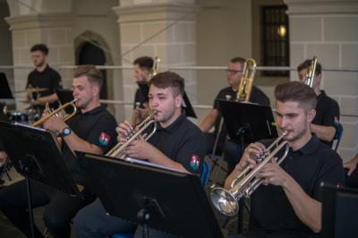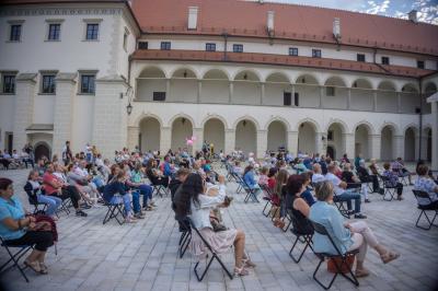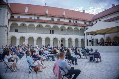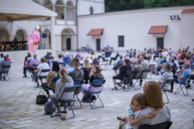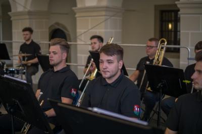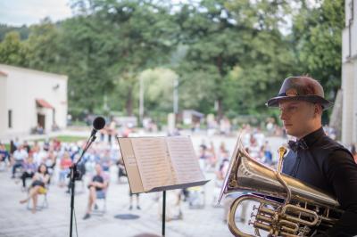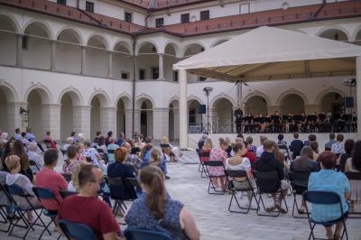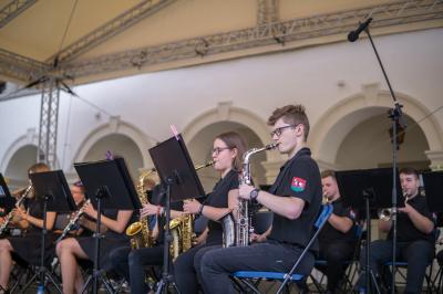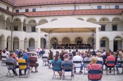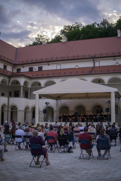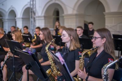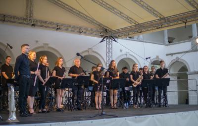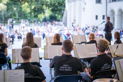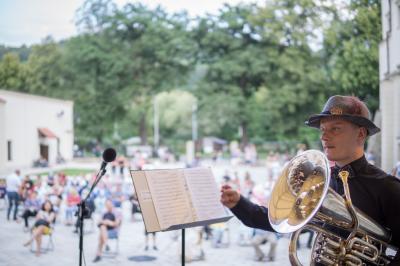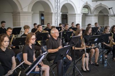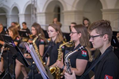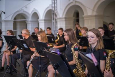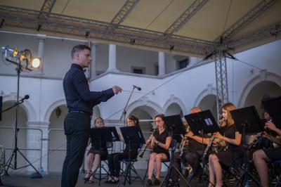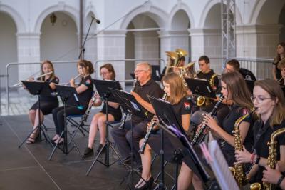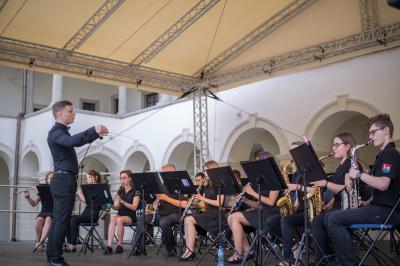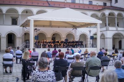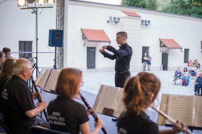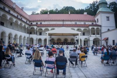 Po kilkumiesięcznej przerwie, spowodowanej epidemią koronawirusa wraz ze zniesieniem niektórych ograniczeń z początkiem lipca orkiestra wróciła do stacjonarnych zajęć i regularnych prób w zamkowych murach, a wyznaczony na drugą połowę sierpnia termin plenerowego koncertu był dla publiczności jedną z nielicznych w ostatnim czasie okazji do muzycznego spotkania z orkiestrą, a także doskonałą motywacją do ćwiczeń dla członków orkiestry, wznawiających próby po tak długiej przerwie. W wakacyjnym koncercie plenerowym, w niedzielny wieczór 23 sierpnia orkiestra zaprezentowała swój repertuar, będący swoistą mieszanką muzyki rozrywkowej, filmowej i marszowej, wzbogacony o nowe utwory i aranżacje. Piękna, zamkowa sceneria, doskonała pogoda i wakacyjna atmosfera koncertu w połączeniu z brawurowym wykonaniem niektórych partii muzycznych, sprawiły, że publiczność bardzo dobrze się bawiła i nagrodziła orkiestrę wielkimi brawami oraz owacjami na stojąco, zachęcając muzyków do bisów.