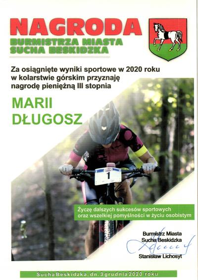 Po raz pierwszy Nagroda Sportowa Burmistrza Miasta trafiła w ręce w Marii Długosz uczennicy Szkoły Podstawowej nr 2 w Suchej Beskidzkiej, uprawiającej kolarstwo górskie w barwach UKS Zawojak. Utalentowana cyklistka pewnie sięgnęła po mistrzostwo województwa w igrzyskach młodzieży szkolnej. Z sukcesami rywalizowała również w szeregu innych imprez o randze ogólnopolskiej.