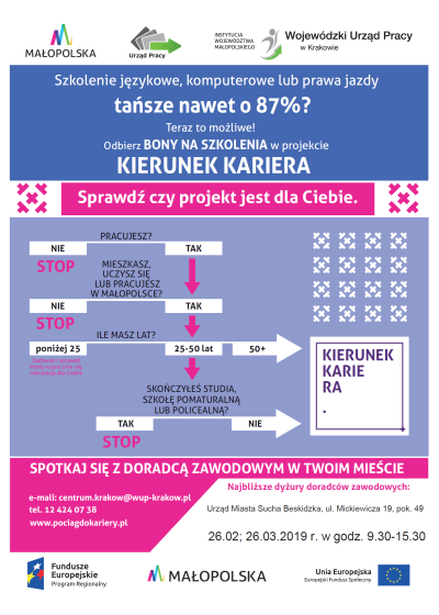 - Na spotkaniu z doradcą porozmawiasz o swojej dotychczasowej karierze zawodowej i możliwościach jej rozwoju. Razem sporządzicie Bilans Twojej Kariery. Z doradcą możesz spotkać się w Krakowie, w Centrum Informacji i Planowania Kariery Zawodowej, Plac na Stawach 1, 30-107 Kraków, tel. 12 4240738 lub całkiem blisko, podczas lokalnego dyżuru naszego doradcy w Suchej Beskidzkiej na terenie Urzędu Miasta Sucha Beskidzka przy ul. Mickiewicza 19 (Pok. 49 na II piętrze) w dniach 26 luty oraz 26.03.2019 r. w godzinach 9.30 – 15.30. Informacja o dyżurach dostępna jest na stronie https://kierunek.pociagdokariery.pl w zakładce „Nasze dyżury w Małopolsce”